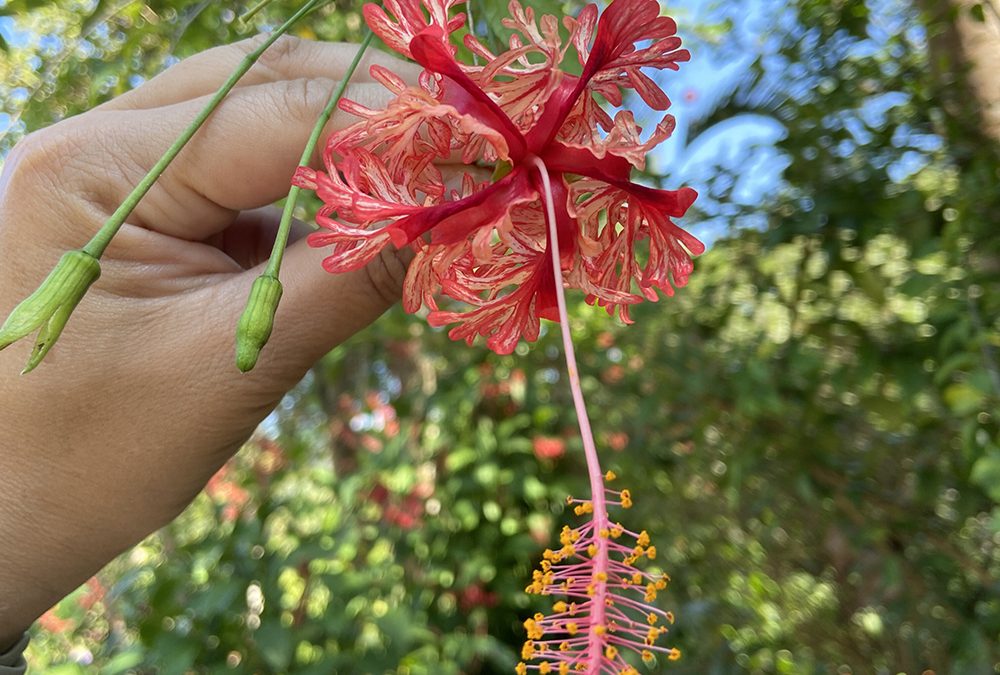 Poh’s analysis begins with the hibiscus flower which cycles through a circadian-rhythmic process called nyctinasty where this flower opens and closes in response to light and synchronization with its pollinators. It’s beautiful bloom only lasts between 24 – 36 hours before the flower wilts and falls to the ground. She is reminded of this as she shares stories about the hibiscus — and depending on the time of the year, students visiting the Conservatory and experiencing a virtual field trip may not see the hibiscus in bloom. She posits that we could offer a picture of a hibiscus or even attempt to preserve a hibiscus flower for students to see in the flower’s absence, but this would not be the same. As an educator, she asks herself, what is her intention for students when learning about the hibiscus? Was it to see its beautiful colours? Was it to feel its delicate petals and witness its cycles? Yes and no. Although she designs the learning experience with an intention for students to come to the conservatory to learn about the biology of the flower and plant, it is even more important for them to learn about its meaning to different cultures, its role as symbol of strength and courage, and a reminder of the planet’s beauty and its resilience as humans moved this plant species to diverse locations on the planet. At the same time, Poh is reminded that as a Nyonya from Malaysian heritage, the red hibiscus was chosen to be her country’s national flower. Bunga Raya (or Celebratory Flower) signifying the unity and courage of the Malaysian people: its five red petals embodying the spirit, resilience, and bravery of the nation. Through this experience Poh develops a much deeper appreciation and connection to the flower after immigrating and living in Canada for more than 30 years – a connection she notes was starting to fade due to geographical and cultural distance.