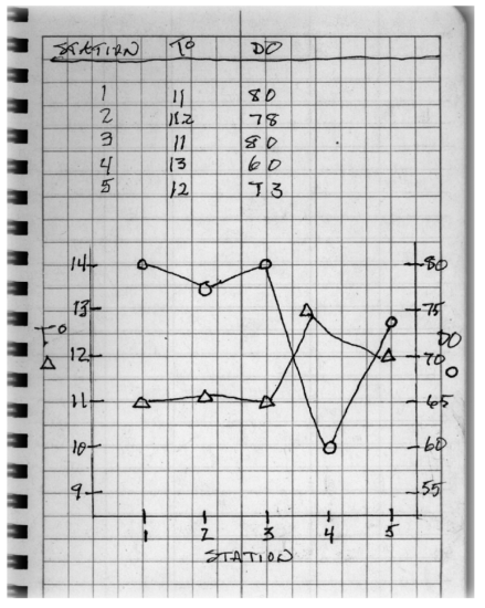 Then, the Temperature and Dissolved Oxygen group gathered together the five temperature and dissolved oxygen samples they had collected on the creek behind the school the day before, each from a different part of the creek. They brought each sample, one at a time, to their lab table, unscrewed the lid of each container, carefully let the probe into the container, and recorded the data presented: Temperature, or Dissolved Oxygen. They did this for each of their five samples, then used a graph to plot their data. The data, as plotted, is shown in the figure here. Their job at this point became how to explain the shape of their curve. They had made careful descriptions of the five stations when they made their water collections in the creek on their school grounds, and noted that there was a small fallen tree near Station 3, which disturbed plants, animals, and the bottom at that site. They decided that the slow rise at Station 4 simply indicated a recovery process might be in place; and, they would measure dissolved oxygen at Station 4 when they next visited the creek.